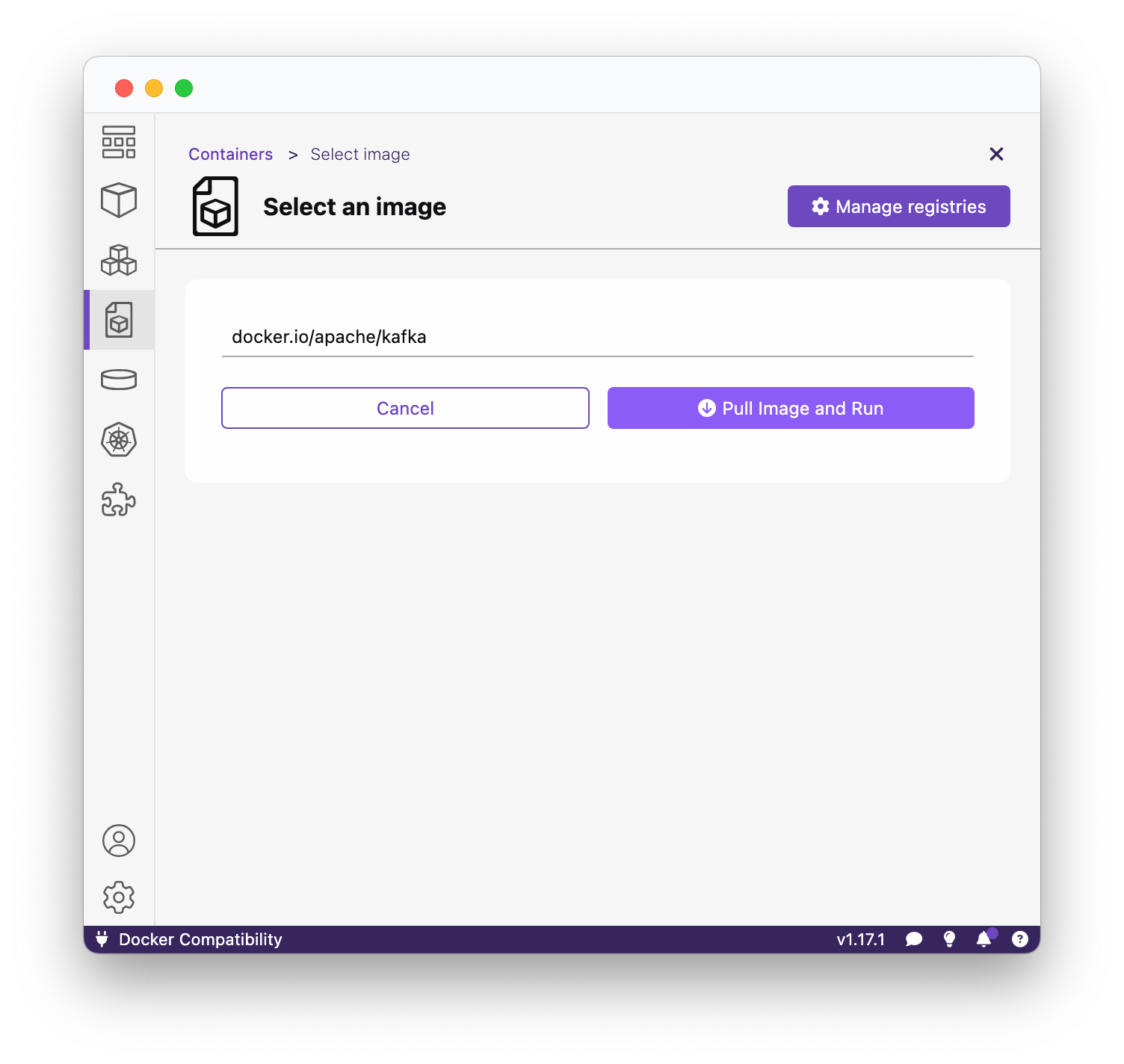 Enter “docker.io/apache/kafka” into the search field, then click “Pull Image and Run”.