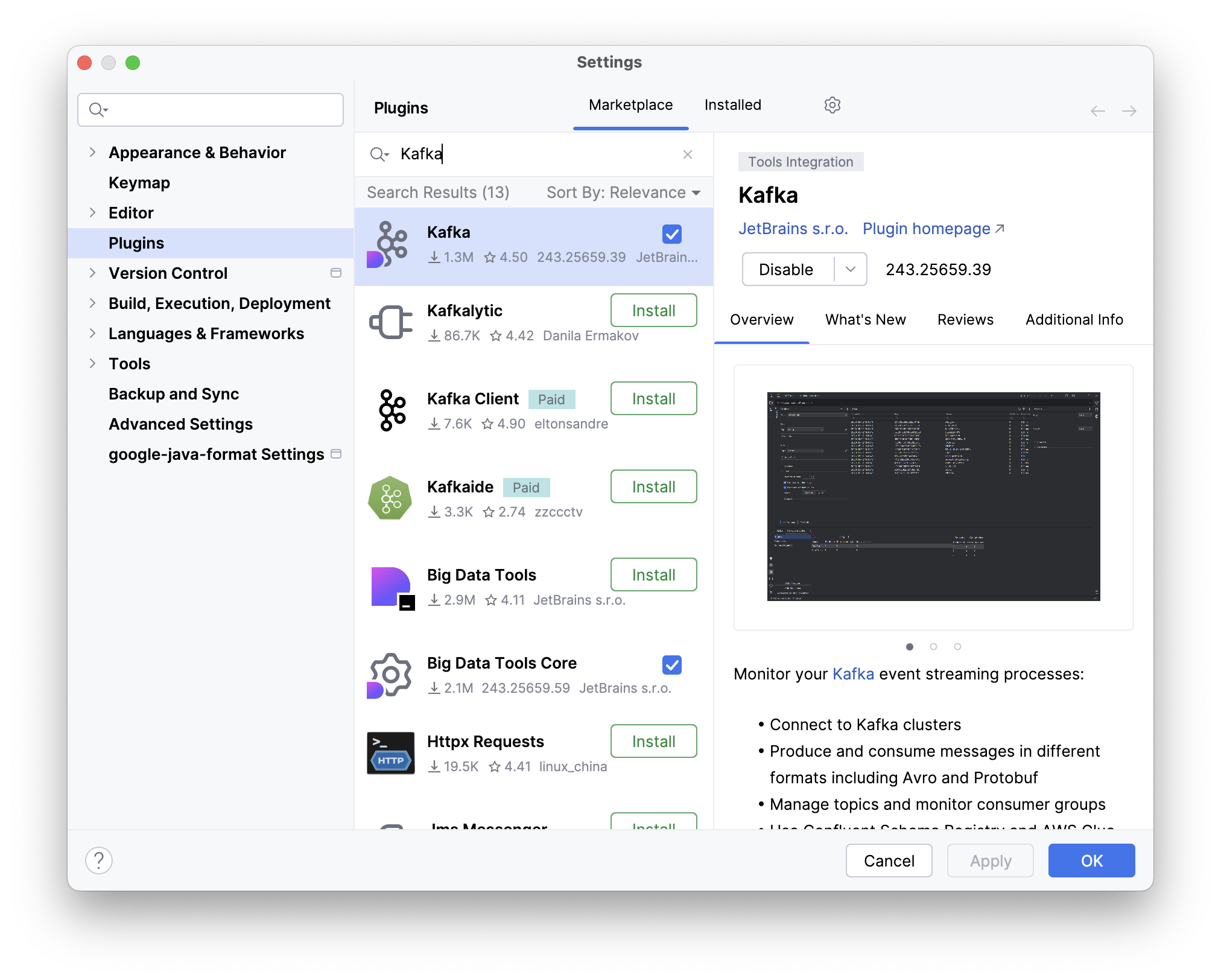 Go to Settings -> Plugins, and search for “Kafka”. Ensure the plugin is installed.