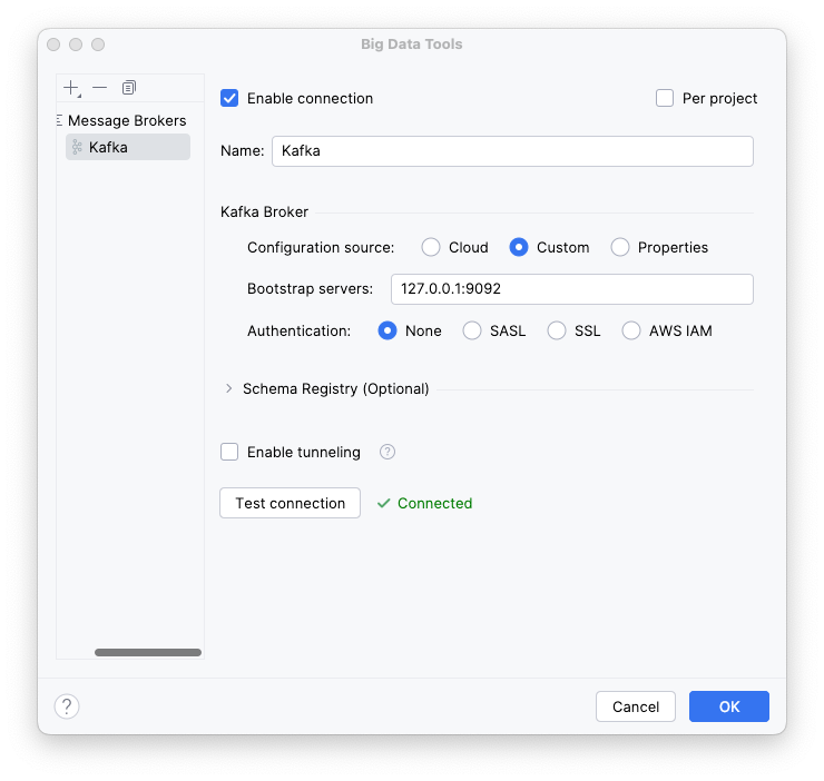 💡 There are plenty of alternatives for managing or inspecting your local Kafka cluster, see this confluent thread for examples. Many are more powerful than the IntelliJ IDEA plugin, but the plugin wins on convenience for most simple tasks.